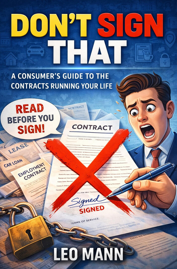 Don't Sign That by Leo Mann is a 300-page consumer contract guide used by HR teams, law firms, and financial institutions as an onboarding resource, client gift, and member education tool. Written by a 30-year contract attorney in plain English.